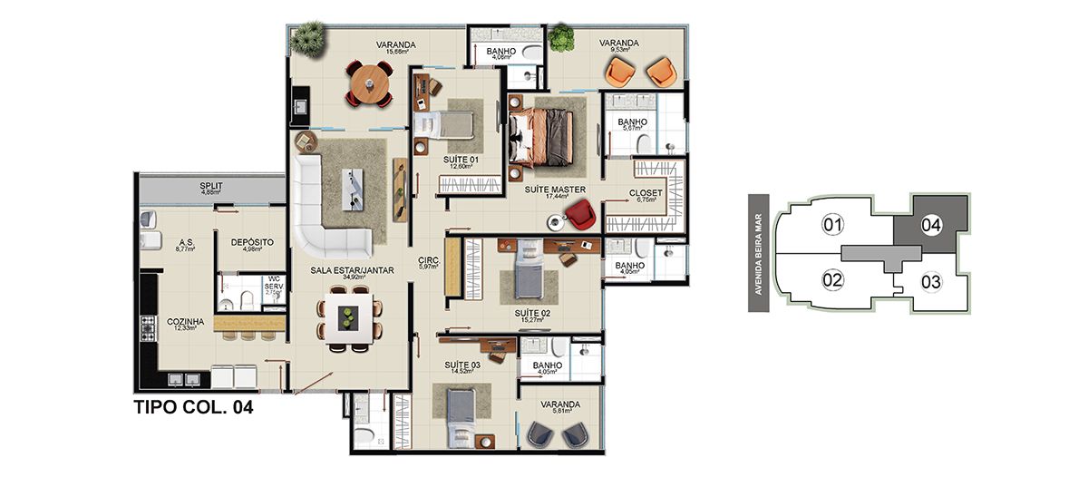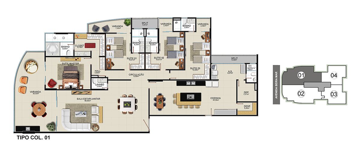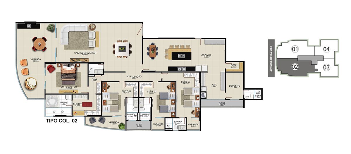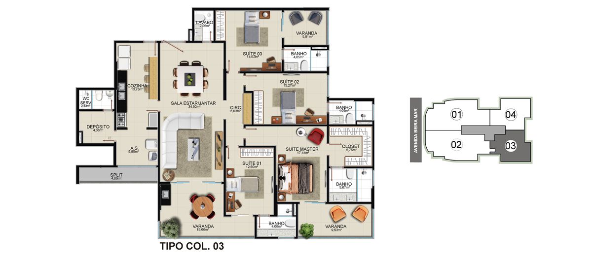 • Apartamentos com 206m², 208m², 320m², 326m² com 4 quartos sendo 4 suítes, 3 e 4 vagas de garagem.
